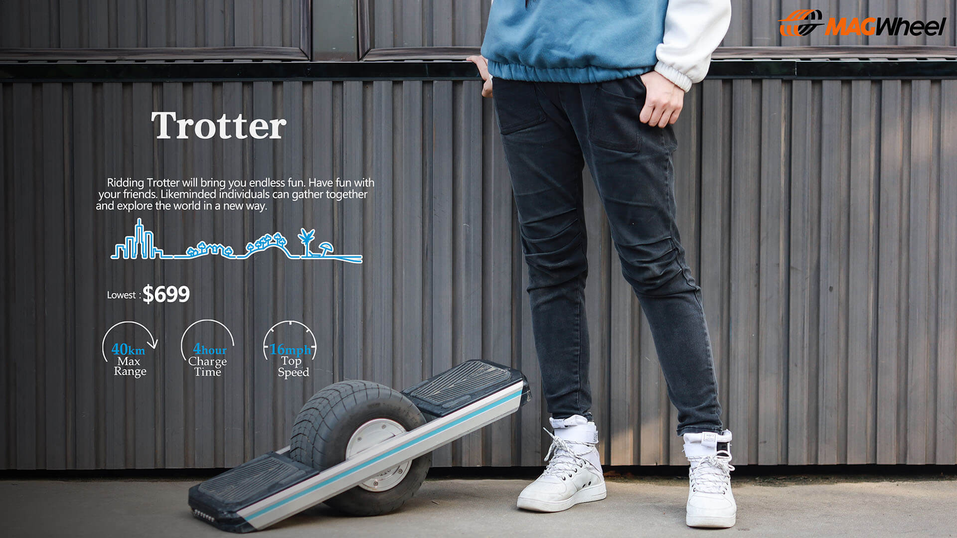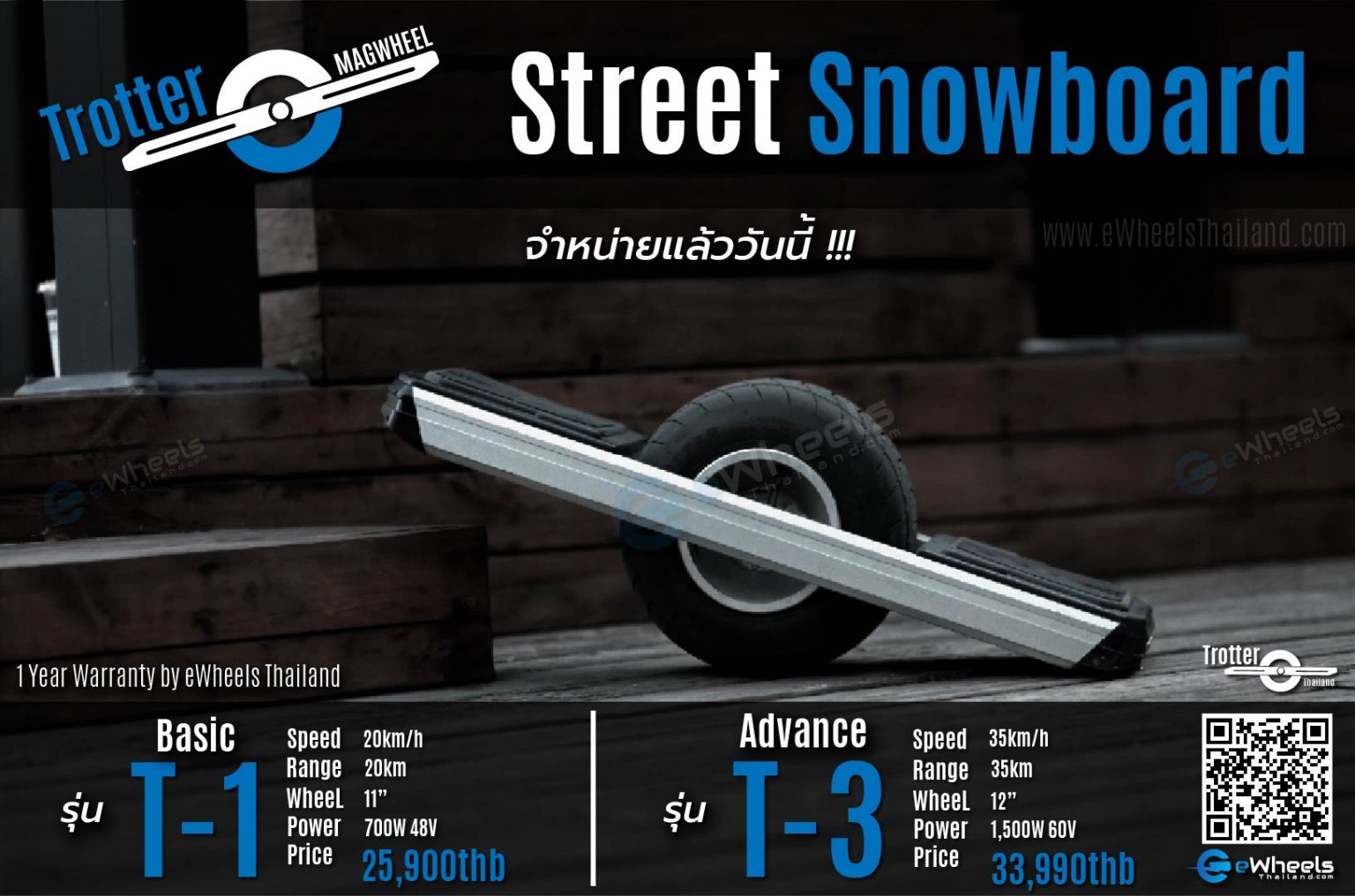 Trotter Magwheel Electric Street-Snowboard (Onewheel) เป็นสเก็ตบอร์ดไฟฟ้าที่ให้อารมณ์การขับขี่เหมือน Snowboard ซึ่งเป็นที่นิยมเป็นอย่างมากทั่วโลก เสนห์ของ Trotter Street-Snowboard อยู๋ที่ความสนุกตื่นเต้น และให้อารมณ์การขับขี่ที่อิศระ และยังสามารถขี่ไปได้ทุกที่แม้จะเป็นทาง Off-road ก็ตาม
