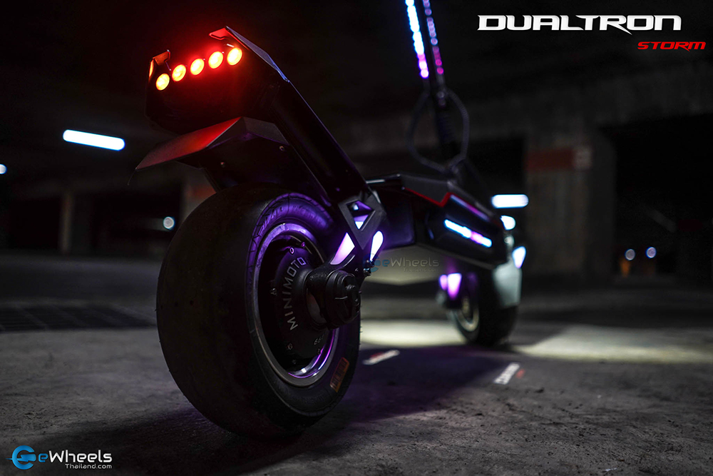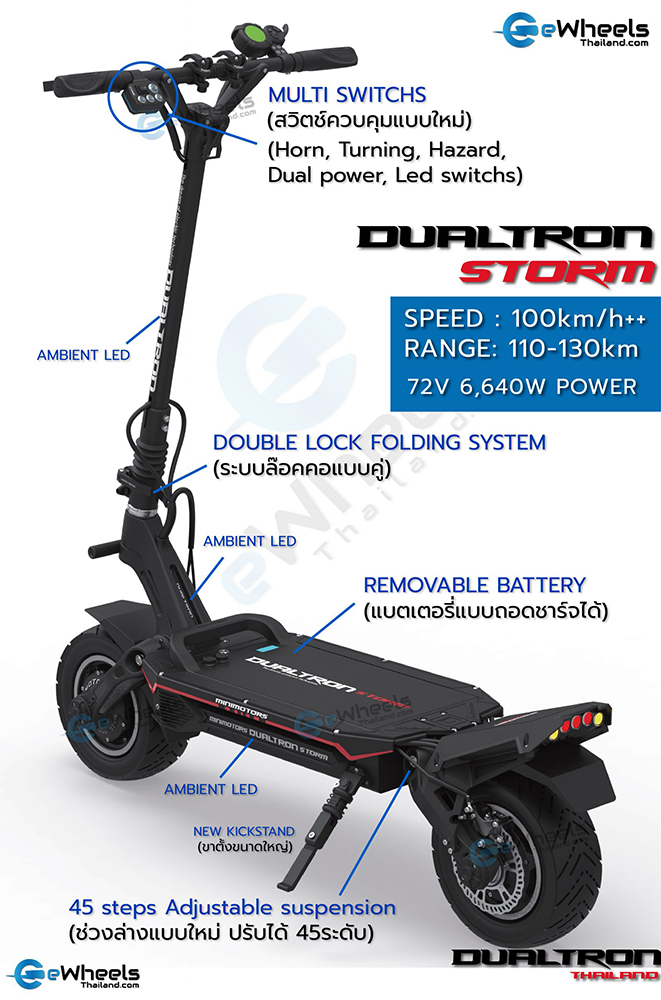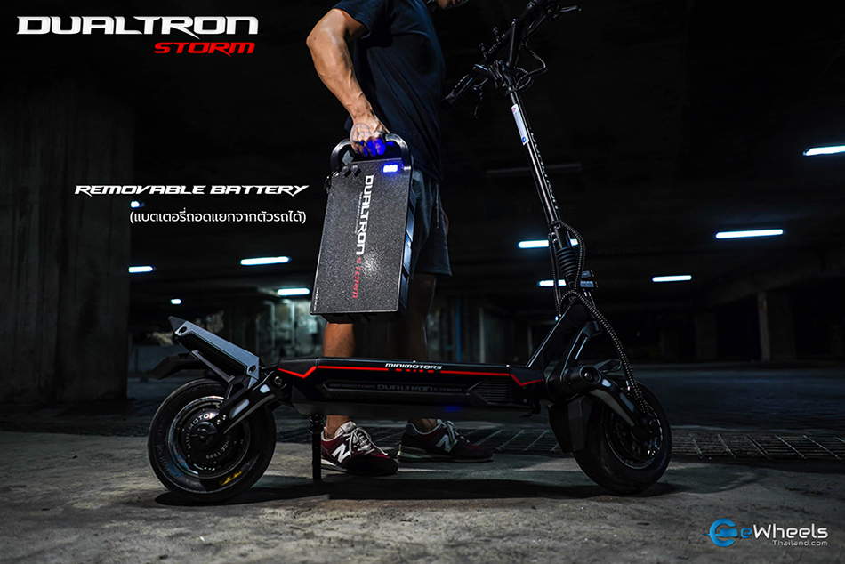สกู๊ตเตอร์ไฟฟ้า Dualtron Storm คือสุดยอดของเทคโนโลยีสกู๊ตเตอร์ไฟฟ้า โดยมาพร้อมกับชุดแบตเตอรี่มาตรฐาน 72 โวลต์ แบบถอดเปลี่ยนได้ LG ขนาด 31.5Ah พร้อมรีโมททำให้คุณสามารถชาร์จแบตเตอรี่ได้ทุกที่ และตัวควบคุมมอเตอร์อัจฉริยะขนาด 40 แอมป์ มอเตอร์ BLDC ขนาด 6,700 วัตต์ ระบายความร้อนด้วยระบบอิเล็คทรอนิกส์